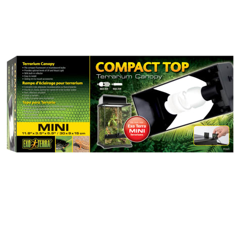 The exo terra compact top canopy is a compact fluorescent terrarium canopy designed for use with the exo terra glass terrarium this easy to install canopy accommodates compact fluorescent bulbs or low wattage incandescent bulbs.